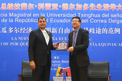 陈吉宁向科雷亚总统赠送演讲纪念牌。记者 苑洁