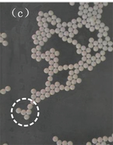图1.(a)漂浮在液体表面的两颗粒由于液桥作用,自发团聚到一起;(b)同理,漂浮的三颗粒应自发趋向于密堆积;(c)实际观察到的一个漂浮颗粒聚集,含许多缺陷(洞)。