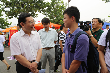 图为校党委书记胡和平与新生亲切交谈。记者 苑洁