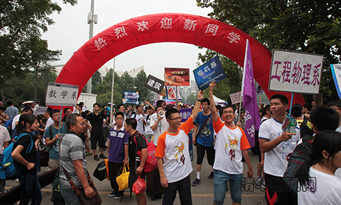 7点35分,又一辆载满新生和家长的清华校车缓缓驶来,各院系负责迎新的志愿者同学赶忙迎上前去,纷纷举起院系指示牌,喊着有院系名称的口号,引领新生到所在院系的迎新点进行报到。