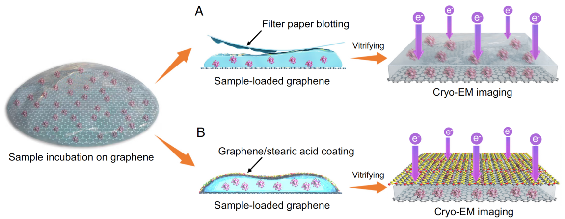 图1.采用石墨烯作为支持膜的冷冻电镜样品制备示意图