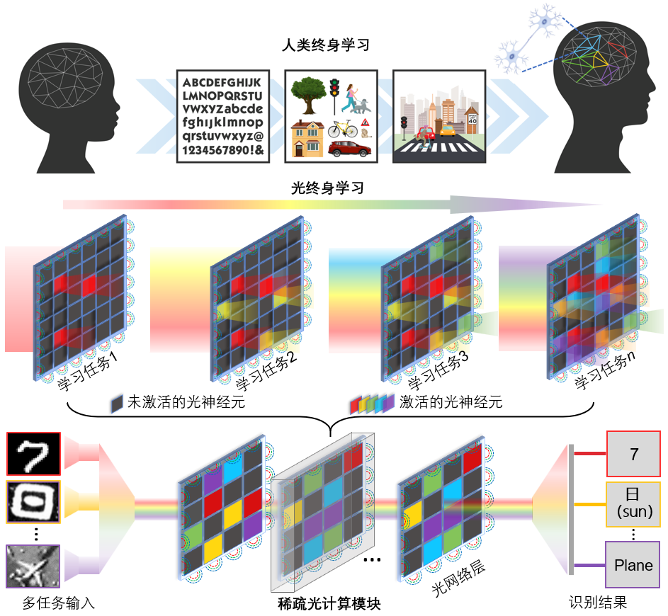 清华新闻网4月2日电 人工智能任务日益复杂、多样且动态变化,传统机器学习方法往往基于固定数据集训练任务,无法适应环境变化,如何使AI系统具备多任务持续学习的能力成为亟需解决的问题。近年来,随着摩尔定律的停滞,以衍射神经网络为代表的光学架构作为新的计算模态,在功能和效率方面展现出巨大潜力。然而,当前光网络仍普遍存在“灾难性遗忘”(catastrophic forgetting)的问题,学习新任务会失去先前任务的记忆。受人脑实现可持续学习的神经突触机制启发,基于光天然物理上的稀疏性和并行性,精品无码久久久久久久久_国产精品一区二区三区四区五区_欧美亚洲国产激情一区二区_午夜精品久久久久久久久久久久_亚洲欧洲中文日韩久久AV乱码_91精品欧美一区二区三区_久久精品一区二区免费播放_日韩高清大片永久免费入口_久久国产欧美日韩精品免费_欧美一区二区三区久久综合_国产精品天天狠天天看电子工程系方璐副教授团队首创了智能光计算终身学习架构,突破光网络单一功能限制,支撑类脑并行多任务学习。通过稀疏光连接及多光谱并行计算等关键模块,赋予光计算系统超越现有技术的功能、通量与能效,为智能系统在边缘硬件的多任务部署提供了光速解决方案。