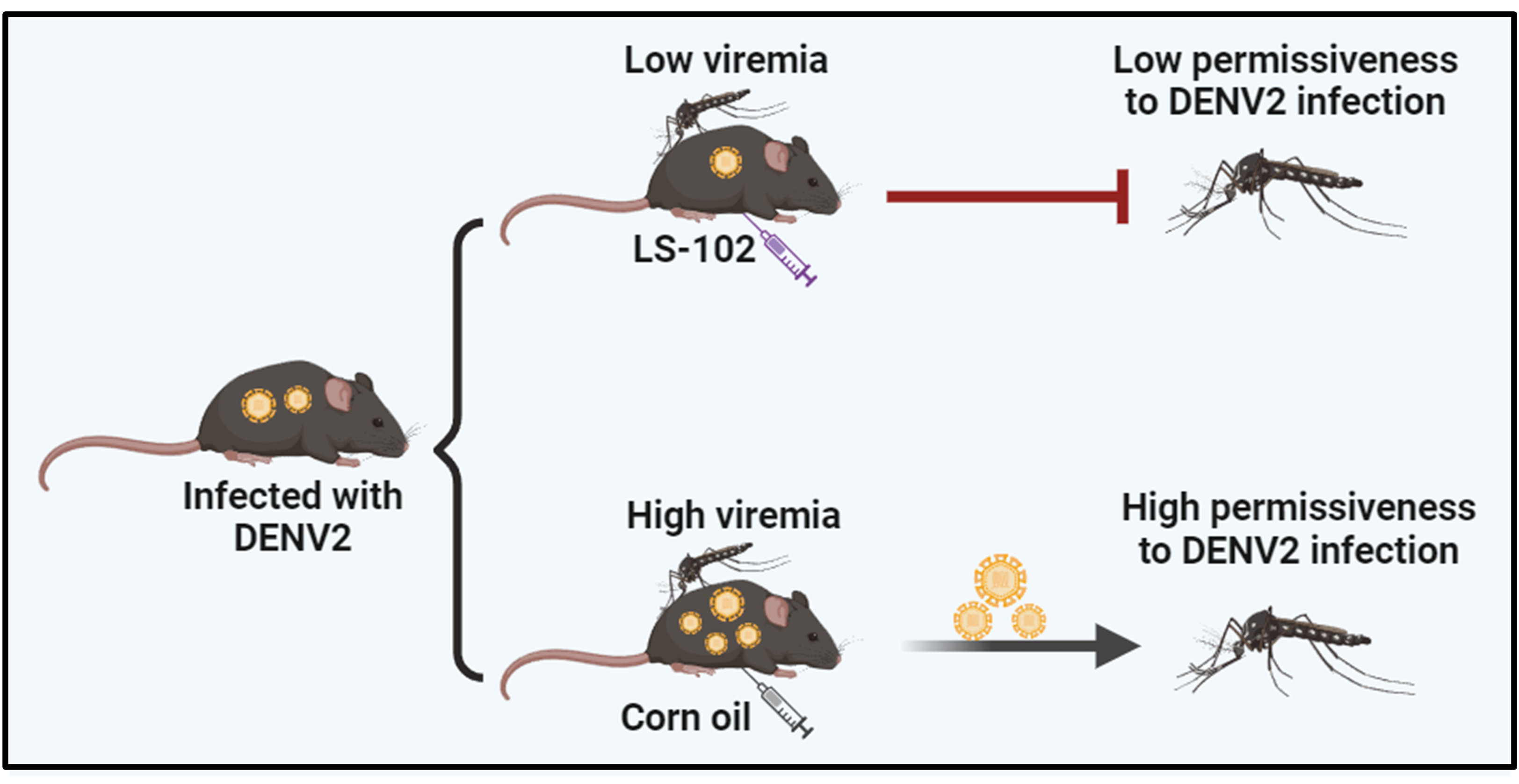 LS-102小分子是HRD1的特异性抑制剂,也是用作治疗类风湿性关节炎等疾病的候选药物小分子。研究者发现LS-102能显著抑制登革病毒感染埃及伊蚊及AG6小鼠模型。最后,研究者利用“感染宿主-蚊虫”的病毒传播模型评估了LS-102小分子抑制剂对登革病毒传播的影响。结果显示,向感染小鼠腹腔注射LS-102可显著抑制登革病毒在小鼠模型上的感染,同时抑制病毒完成“宿主-蚊虫”的传播周期,大幅降低蚊虫的感染率(图2)。以上数据证明LS-102是一种潜在的阻抑黄病毒感染与传播的候选药物分子。