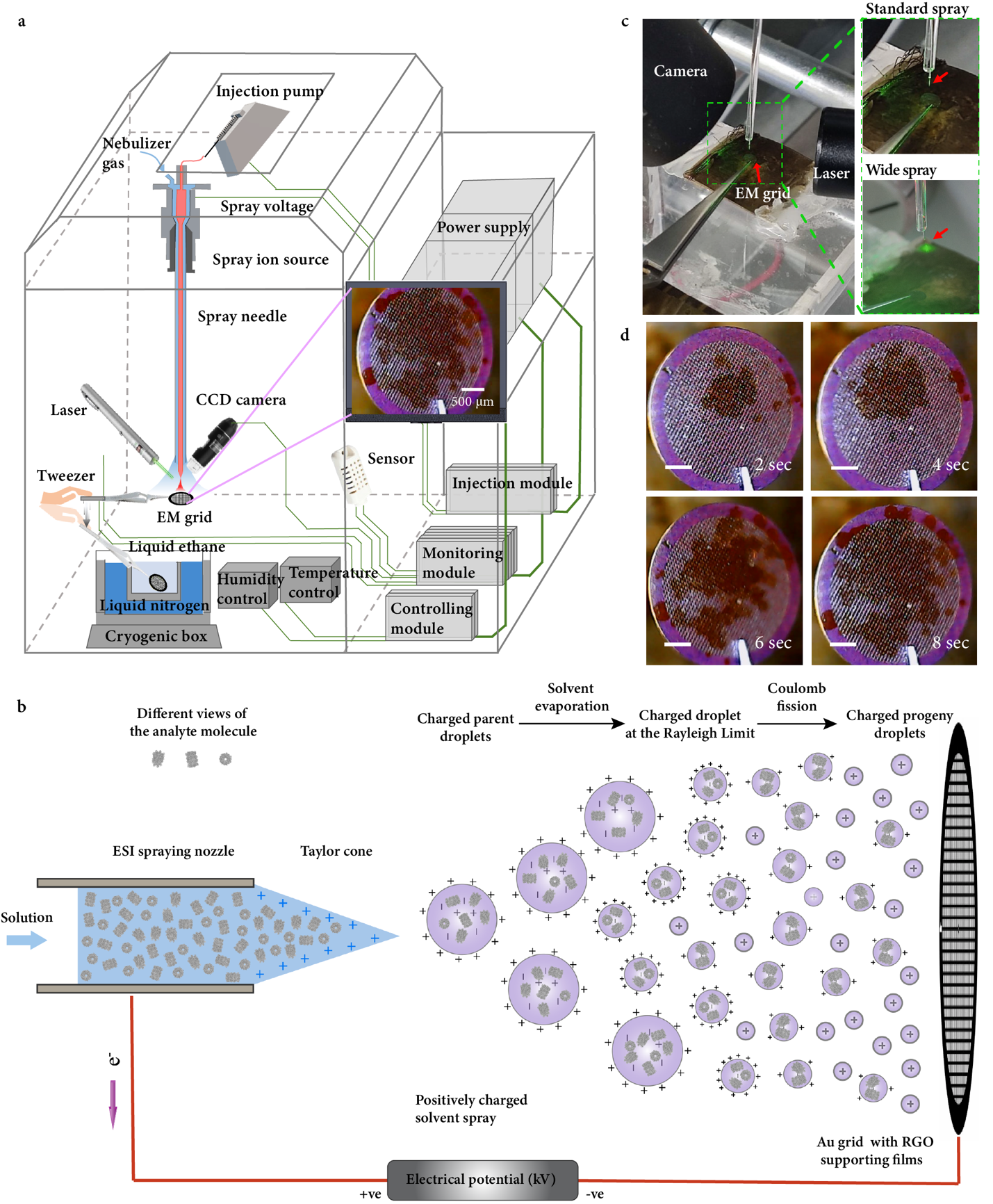4月25日,精品无码久久久久久久久_国产精品一区二区三区四区五区_欧美亚洲国产激情一区二区_午夜精品久久久久久久久久久久_亚洲欧洲中文日韩久久AV乱码_91精品欧美一区二区三区_久久精品一区二区免费播放_日韩高清大片永久免费入口_久久国产欧美日韩精品免费_欧美一区二区三区久久综合_国产精品天天狠天天看生命科学学院王宏伟课题组和精密仪器系欧阳证、周晓煜课题组在《自然·方法学》(Nature Methods)在线发表了题为“电喷雾辅助的冷冻电镜样品制备方法用以减轻界面吸附效应”(Electrospray-assisted cryo-EM sample preparation to mitigate interfacial effects)的研究论文。研究采用非变性质谱(Native mass spectrometry, native MS)中广泛使用的电喷雾电离(Electrospray ionization, ESI)技术,设计并搭建了一种新型冷冻样品制备装置ESI-cryoPrep(图1),成功实现了无需滤纸夹吸的冷冻样品制备,并获得了多种生物大分子近原子分辨率的三维结构。