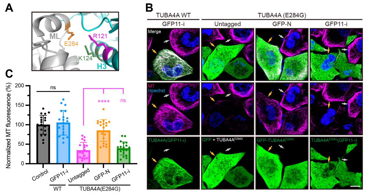 最后,为了探究GFP11-i能否高效标记带有人类疾病突变的微管蛋白突变体,研究人员将已知与人类不育相关的α-微管蛋白TUBA4A(E284G)突变体表达在HeLa细胞系中,发现该疾病突变体严重破坏了微管网络的形态(图3A-C)。进而,研究人员分别表达了传统GFP标记或GFP11-i标记的TUBA4A(E284G),发现GFP标记严重干扰其病理学表型,而GFP11-i则能够高保真地对突变体微管蛋白进行活细胞荧光标记(图3A-C),提示其在微管蛋白相关疾病研究中的重要应用潜力与价值。