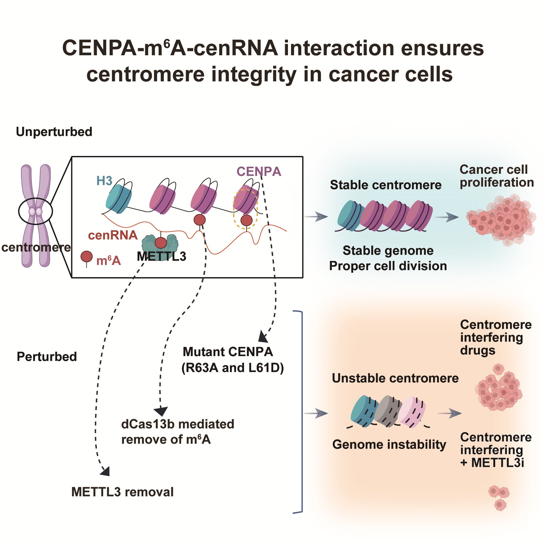 鉴于CENPA对于染色体着丝粒功能中的关键作用,研究者进一步评估了CENPA与甲基化cenRNA的互作对着丝粒稳态及癌症细胞生长的影响。结果显示,去除cenRNA上的m6A修饰或突变CENPA均会导致着丝粒不稳定,染色体分离异常,细胞生长减缓,并使肿瘤细胞对着丝粒相关药物的敏感性增强。值得注意的是,这种现象在正常细胞中并未观察到,进一步支持了靶向CENPA-m6A-cenRNA作为癌症治疗策略的可行性(图1)。