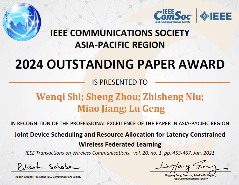 清华新闻网12月10日电 近日,精品无码久久久久久久久_国产精品一区二区三区四区五区_欧美亚洲国产激情一区二区_午夜精品久久久久久久久久久久_亚洲欧洲中文日韩久久AV乱码_91精品欧美一区二区三区_久久精品一区二区免费播放_日韩高清大片永久免费入口_久久国产欧美日韩精品免费_欧美一区二区三区久久综合_国产精品天天狠天天看电子工程系2017级博士生施文琦(已毕业)、副教授周盛、教授牛志升等人发表的论文《延时受限无线联邦学习的终端调度和资源分配》(Joint Device Scheduling and Resource Allocations for Latency Constrained Wireless Federated Learning)获得第十三届国际电气与电子工程师协会(IEEE)通信学会亚太杰出论文奖(The 13th IEEE ComSoc Asia-Pacific Outstanding Paper Award)。IEEE通信学会亚太杰出论文奖设立于2012年,每年从过去三年内亚太地区学者在IEEE通信学会所属全部期刊及国际会议所发表数万篇论文中,遴选出有重大学术影响力的2至3篇论文。