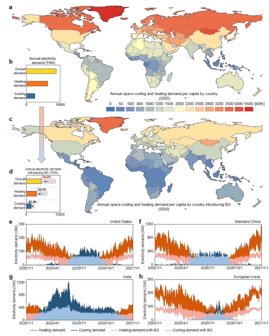 基于全球建筑能耗模型的实验,张璇团队还发现,“人体电网”在各类气候条件下均能有效降低制冷与供暖需求,每年可节省约6611TWh电力,约占全球建筑暖通电力消耗的50%。这一发现为应对全球能源危机与碳减排提供了全新路径。若进一步提升“人体电网”的供暖或制冷设备性能(降低或升高服务阈值),其节能效果将更为突出。