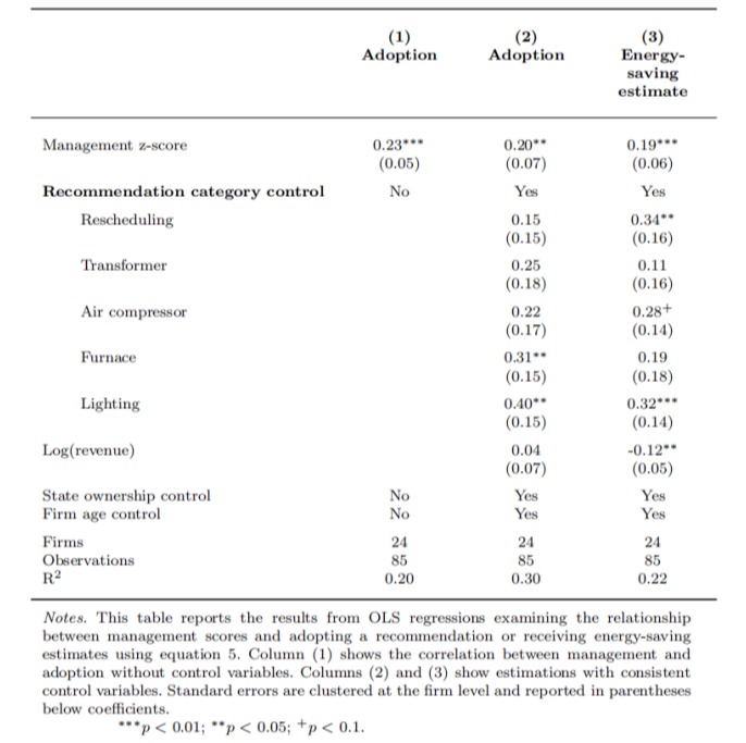 该研究还发现企业自身的管理水平会对节能建议采纳意愿以及能源使用产生影响。如表1所示,管理实践得分(Management z-score)与节能建议采纳率呈正相关,分数每增加1单位标准差,建议采纳的可能性提升20%至30%。相较于管理水平较高的企业,较低管理水平企业在干预后单位用电成本降低的幅度更大,这表明能源审计能够帮助这些企业弥补管理上的不足,从而实现降本增效。此外,研究发现干预效果与节能建议的类型有关,其中,针对变压器的建议是影响结果的主要因素,能使单位电力成本下降16%。这是由于不少较低管理水平企业在干预前向电力公司提交了过高的最大负荷,导致电费计量中的固定成本增加,而针对此问题的建议相对操作简便,因此产生了显著的积极影响。