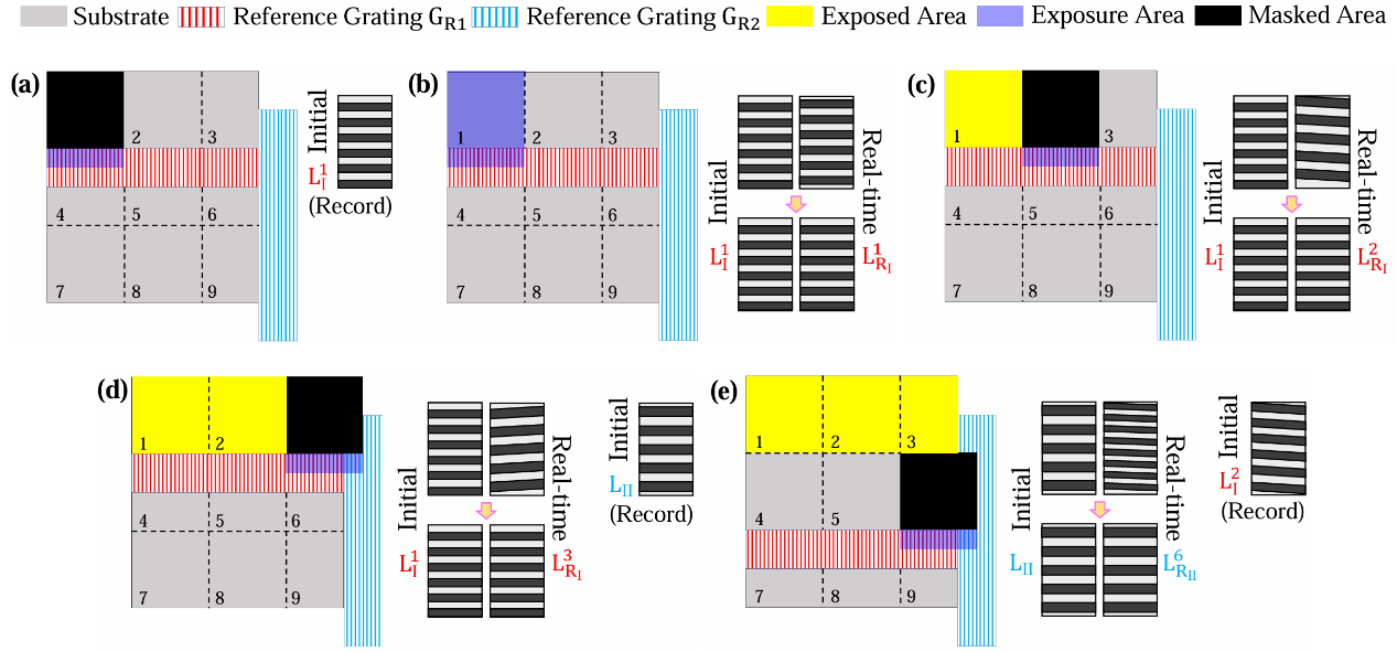拼接曝光加工流程如图2所示,其中在同一行上拼接时,使用参考光栅GR1产生的参考条纹进行条纹锁定,如图2(a)-(c)所示,这时通过移动反射镜来改变曝光区域位置。在换行拼接时,需要通过锁定参考光栅GR2产生的参考条纹后,重新记录参考光栅GR1的初始参考条纹,如图2(d)-(e)所示,换行通过移动基底来改变曝光区域位置。