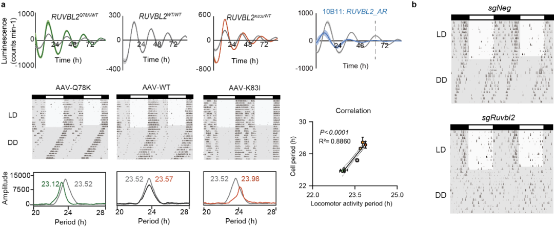 (a)在细胞中敲入突变会导致长周期、短周期或无节律的表型,而在小鼠SCN过表达RUVBL2突变体可重现长周期和短周期的节律变化。此外,细胞与小鼠的周期表型呈线性相关;(b)在小鼠SCN中敲除Ruvbl2会导致其在恒定黑暗条件下丧失活动节律