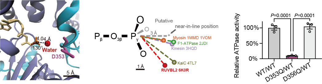 图2.在人源RUVBL1/RUVBL2复合物的ATP结合口袋中,水分子的位置与蓝藻KaiC相似,都处在一种非优化的进攻ATPγ-磷酸基团的状态,因而决定了它们是一类极慢速的ATP水解酶