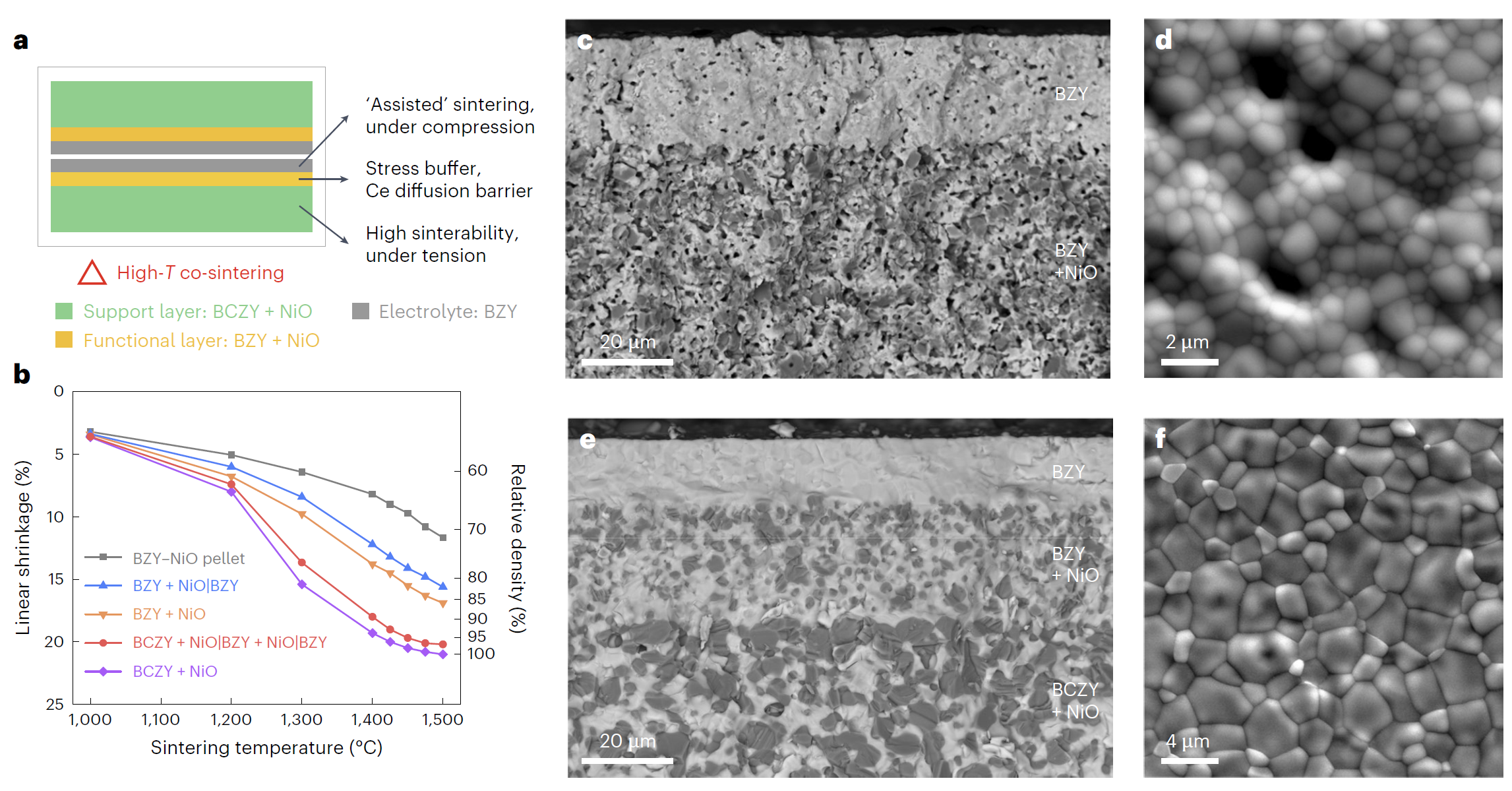 基于上述背景,精品无码久久久久久久久_国产精品一区二区三区四区五区_欧美亚洲国产激情一区二区_午夜精品久久久久久久久久久久_亚洲欧洲中文日韩久久AV乱码_91精品欧美一区二区三区_久久精品一区二区免费播放_日韩高清大片永久免费入口_久久国产欧美日韩精品免费_欧美一区二区三区久久综合_国产精品天天狠天天看材料学院董岩皓助理教授与合作者美国新墨西哥州立大学罗红梅教授、美国麻省理工学院李巨教授和美国爱达荷国家实验室丁冬研究员提出了基于高活性支撑层烧结应力辅助的多层共烧技术,通过支撑层、过渡层和质子膜中氧化镍第二相和铈掺杂浓度的一体化设计,首次在1450摄氏度实现了无烧结助剂、高致密度锆酸钡基质子膜和高性能电化学器件的制备(图1)。研究表明,锆酸钡基质子膜燃料电池和电解池具有优异的电化学性能和稳定性(图2),能够在450至600摄氏度、0.5至0.7个大气压的高水蒸气分压和0.5至2.0安培每平方厘米的高电解电流下展现出高法拉第效率和优异的稳定性,相较于传统的铈酸钡基电解质优势明显。锆酸钡陶瓷烧结技术的突破,有望为高功率密度陶瓷质子膜燃料电池和极端工况电解池的研发与应用提供有力支撑。