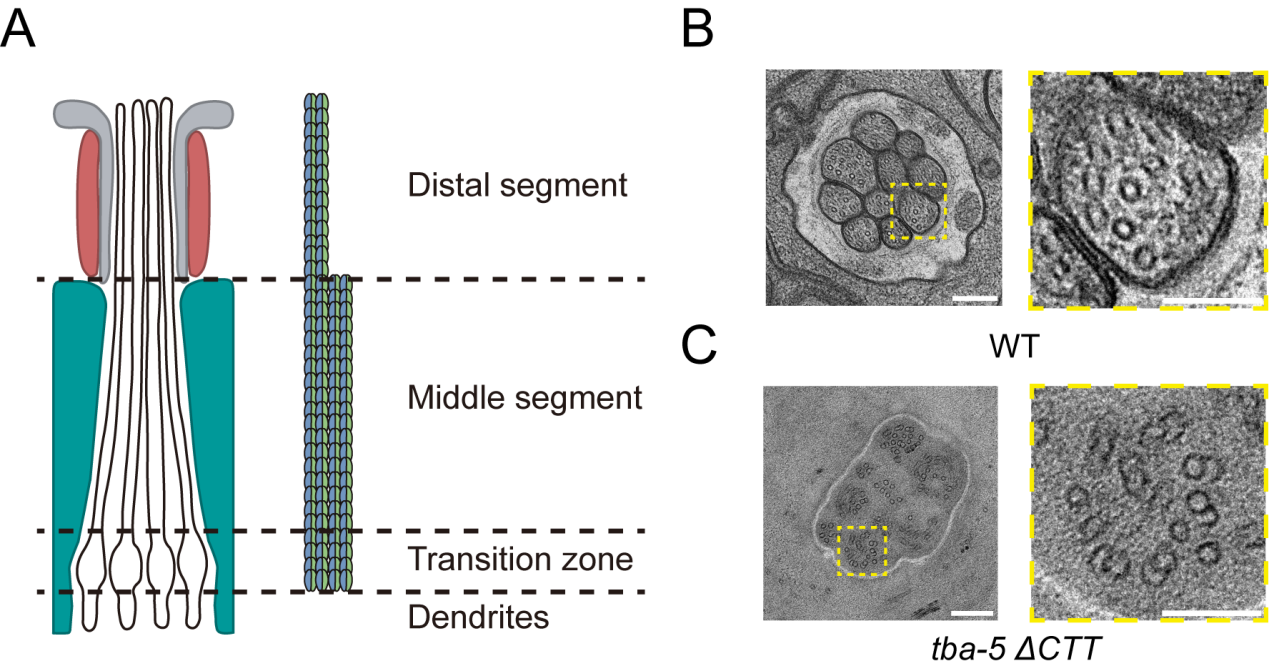 图1.(A)线虫感觉神经纤毛结构示意;(B-C)删除α微管蛋白尾部导致远端段异常生成双联体微管(比例尺:左列200nm,右列100nm)