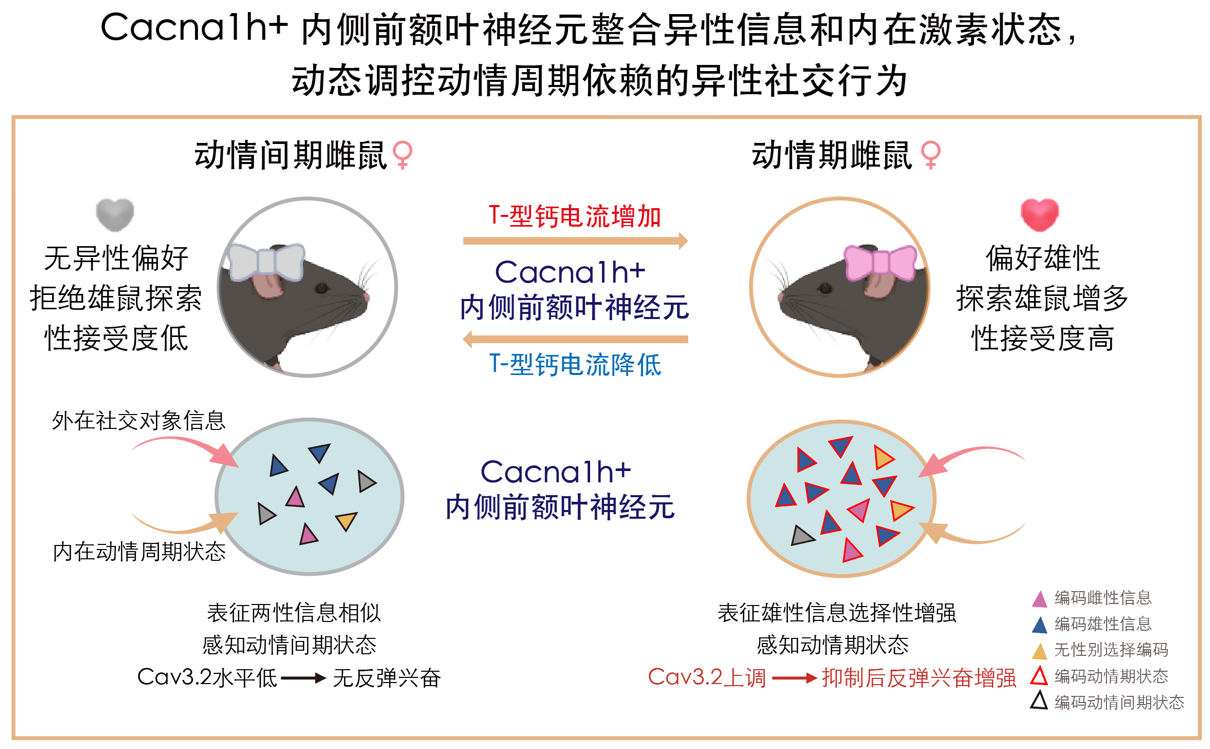 该研究聚焦于内侧前额叶皮层,鉴定出一类特异表达Cacna1h的神经元群体,作为调控“恋爱兴趣”的关键神经单元,能够混合编码个体激素状态与社交对象的性别信息,并以性别相反的方式调控异性社交兴趣与性行为。该研究构建了一个两性差异的前额叶—下丘脑调控模型,揭示了激素状态与社交信息在皮层水平的整合机制,发现本能社会行为的灵活适应性依赖于前额叶的自上而下精细调控,为深入理解与性别相关的异性社交障碍提供了理论基础和潜在干预靶点。