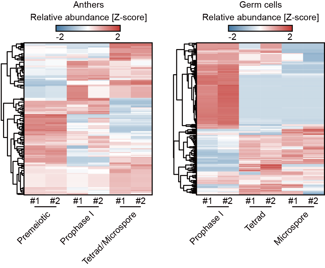 课题组收集了减数分裂前期、减数分裂I早前期和四分体/小孢子期的玉米花药,并用显微摄取的方法分离了处于减数分裂I早前期、四分体时期和小孢子时期的雄性生殖细胞(图1)。通过低起始量小RNA测序,在这些样品中系统鉴定了上万个21-nt phasiRNA。他们接着采用低起始量降解组测序检测了21-nt phasiRNA可能介导的mRNA切割信号。结果显示,在减数分裂前期、减数分裂I早前期和四分体/小孢子期的花药中,21-nt phasiRNA分别切割132、132和119个靶标mRNA;而在减数分裂I早前期的雄性生殖细胞、四分体和小孢子中,21-nt phasiRNA分别切割246、181和143个靶标mRNA,表明玉米中的21-nt phasiRNA可通过切割mRNA,调节基因表达。