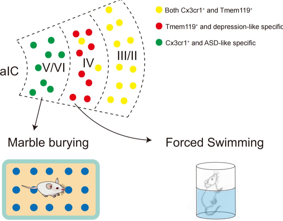 研究团队通过PLX5622灭活小鼠aIC区域的小胶质细胞后发现,aIC小胶质细胞的全部丢失会诱发小鼠的抑郁样和自闭样表型。接着,研究团队研究了自闭症模型小鼠和抑郁症模型小鼠,发现小鼠aIC脑区的Cx3cr1阳性小胶质细胞和Tmem119阳性小胶质细胞的形态异常与两种疾病分别相关。进一步,研究团队通过使用条件性AAV和特异性Cre工具鼠,分别抑制小鼠aIC的Cx3cr1阳小胶质细胞和Tmem119阳性小胶质细胞,发现Cx3cr1阳性细胞被抑制后,小鼠表现出自闭样行为,并不表现出抑郁样行为;而Tmem119阳性细胞被抑制后,小鼠仅表现出抑郁样行为。这些结果表明aIC存在不同亚型的小胶质细胞,它们分别调控不同的行为。