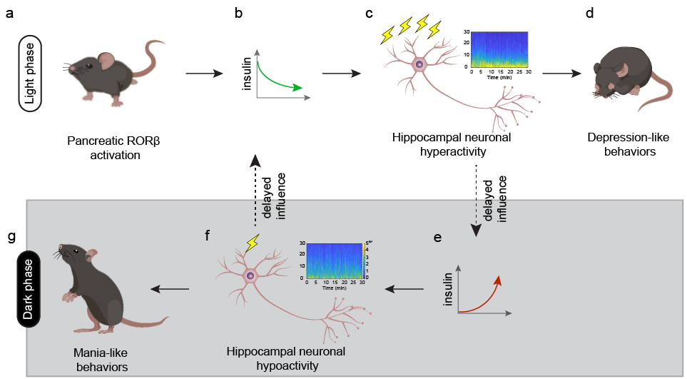 由于RORβ过表达会抑制胰岛素分泌,研究人员因此推测在光相的胰岛素分泌不足和抑郁样行为是RORβ过表达的直接后果,暗相的胰岛素分泌过度和躁狂样行为是代偿作用产生。为了理解这个过程的发生,研究人员结合化学遗传学和在体电生理技术,阐明了大脑海马脑区和胰腺之间胰-脑轴的工作原理,以及RORβ在光相通过扰动胰-脑轴使得小鼠在暗相出现躁狂样行为的机理。具体发生过程如下:第一,RORβ在胰岛表达上调在光相阶段抑制胰岛素分泌;第二,胰岛素缺乏导致海马神经元活动上调;第三,光相中海马区过度活跃不仅引发了抑郁样行为,还产生了延迟且持久的反馈效应,促进了暗相胰岛素的释放;第四,暗相胰岛素分泌上调对海马神经元活动产生抑制,从而产生了次级的躁狂症状;第五,小鼠在暗相的海马区低活性减弱了光相胰岛素分泌的驱动力,因此暗相胰岛素分泌的高水平无法在光相维持,胰岛素水平开始回落;第六,当胰岛素分泌返回初始点后,胰岛RORβ过表达启动下一个循环,从而形成一个昼夜闭环。