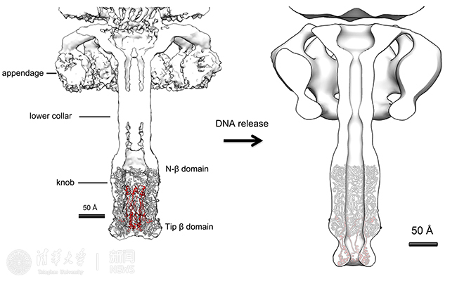 左图:噬菌体φ29尾部蛋白gp9晶体结构与成熟噬菌体病毒颗粒冷冻电镜三维重构结果拟合示意图,其中红色部分为具有形成孔道性质的疏水性肽段(L loop);右图:经过酸诱导DNA释放后噬菌体冷冻电镜三维重构尾部结构以及根据电子密度模拟搭建的gp9结构。可以看到在酸诱导DNA释放后,L loop能够从gp9形成的通道中翻转出来形成独立新的孔道结构。