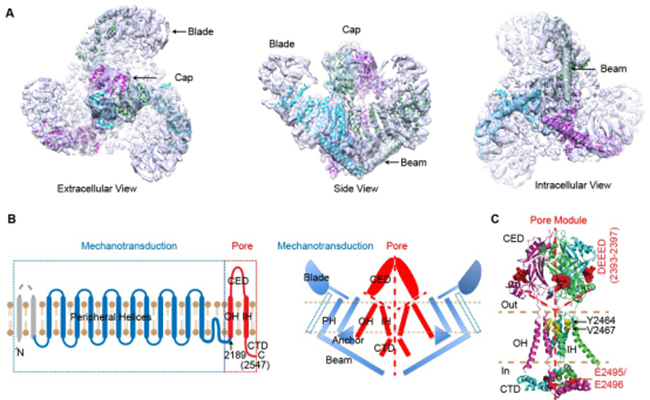 (A) Piezo1通道的三叶螺旋桨结构(Ge et al., Nature 2015);(B)Piezo1离子通道机械力传导和孔道区模块示意图,左为拓扑模型,右为结构模型(Zhao et al., Neuron 2016); (C)Piezo1孔道区模块结构图及控制离子流通的重要功能位点(Zhao et al., Neuron 2016)。