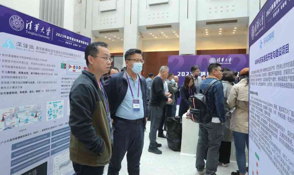 在主楼大厅,高端光通信电芯片、泛半导体制造数智化、新一代无线通讯射频前端芯片等一批校友创新创业项目成果的展示吸引了众多与会者驻足参观。