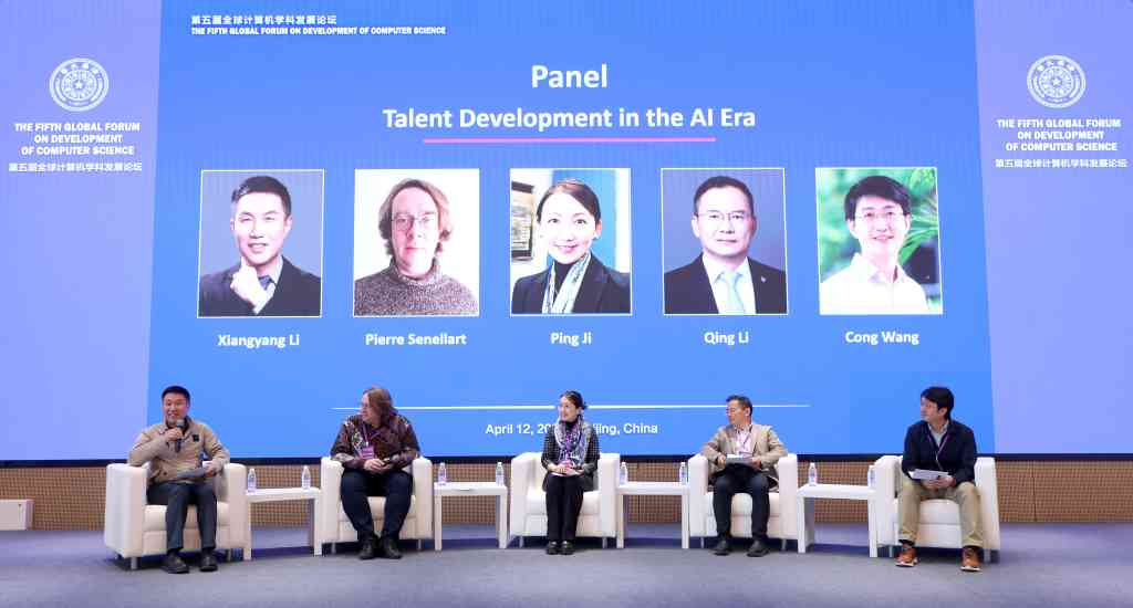 中国科学技术大学计算机科学与技术学院执行院长李向阳(Xiangyang Li)、香港城市大学计算机科学系主任王聪(Cong Wang),以及三位主旨演讲嘉宾围绕“人工智能时代的人才发展”进行了专题研讨。