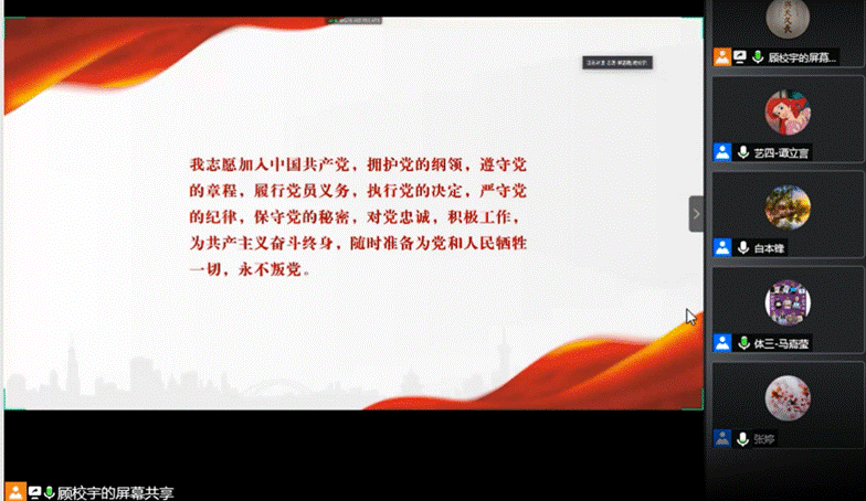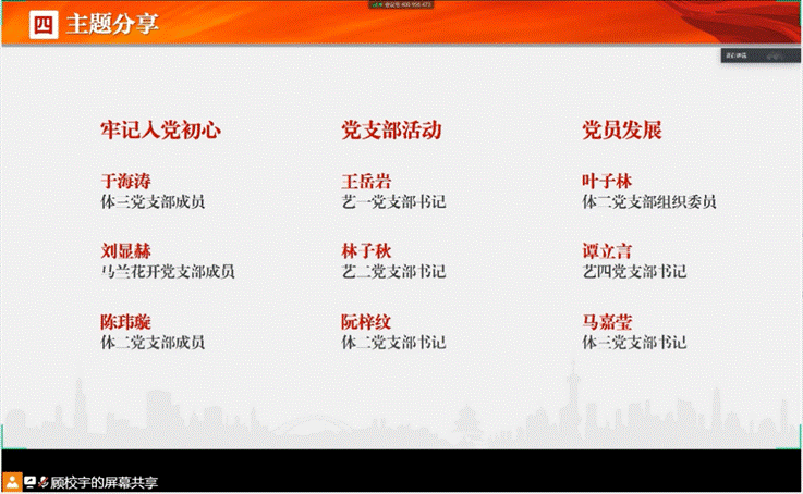 来自学生艺术团和体育代表队党支部的9名成员围绕牢记入党初心、丰富党支部活动、严格党员发展流程等主题进行了分享。马兰花开党支部成员刘显赫讲述了祖父坚守入党初心、终生甘于奉献的故事,以及自己下定决心向党组织靠拢的心路历程。体育代表队第二党支部书记阮梓纹分享了党支部通过丰富活动形式、提升活动质量、强化组织建设、调动成员积极性等方式加强支部凝聚力的相关经验。体育代表队第三党支部书记马嘉莹分享了通过严肃党内政治生活、明确党支部骨干责任、加强入党联系人督导等来规范党员发展工作的经验。