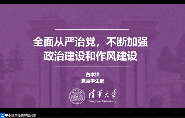 白本锋向参会师生讲授了以“全面从严治党,不断加强政治建设和作风建设”的专题党课。白本锋希望同学们认真学习习近平总书记关于“如何做一名合格的共产党员”的系列论述,并表示,政治建设和作风建设永远在路上,作为党员要坚定理想信念、加强党性修养、甘于奉献、带头作为、遵守党纪国法、廉洁正派、牢记共产党员的初心与使命。白本锋通过一系列正反面案例告诫各位党员,要认真检视反思身边存在的问题,不断提高政治站位,不忘作为“旗帜”“标杆”的使命,时刻做到慎独、自律,真正做到表里如一、言行一致,充分展现清华人应有的精神风貌。