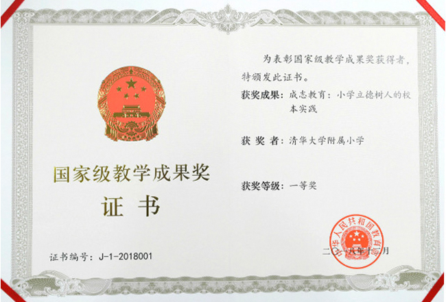 在2018年国家级教学成果奖评选中,清华附小整体育人成果《成志教育:小学立德树人的校本实践》获得一等奖。这是自2014年《小学语文主题教学实践研究》获得首届基础教育国家级教学成果一等奖后,清华附小又一次摘得一等奖,清华附小也成为全国唯一连续两次获基础教育国家级教学成果一等奖的单位。