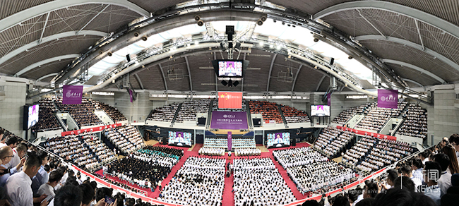 在综合体育馆主会场,各院系中外研究生新生参加典礼。深圳国际研究生院的1200余名研究生新生在深圳国际研究生院分会场参加典礼。