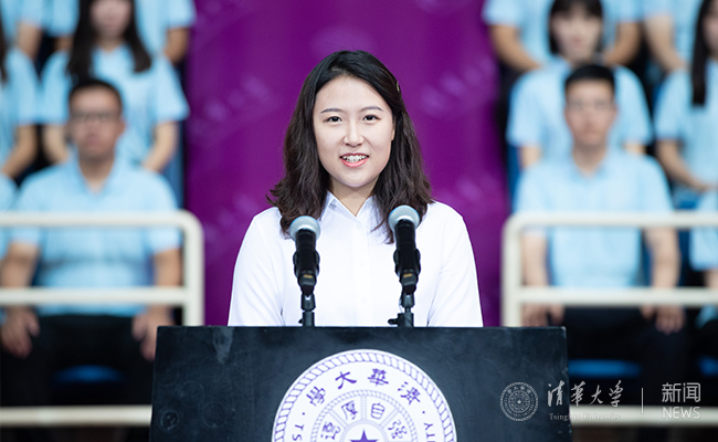 建筑学院博士生张琳代表新生发言。她说,清华赋予我们的是广阔的平台,是宝贵的机遇,同时也是许多未知的挑战。面对着未来或许并不平坦的道路,我们更需要保持旺盛的探索能力,锤炼坚韧的恒心毅力,打造过硬的本领实力,来坚守住最原初的梦想。