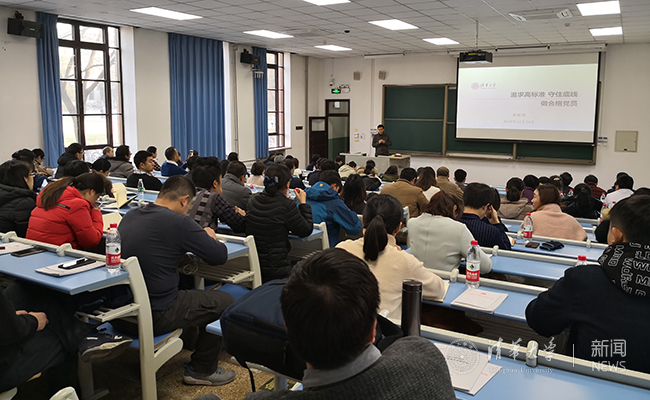 清华新闻网12月17日电 12月14日,由校党委组织部举办的2018年教职工新党员学习班的集中学习环节在二教举行。2018年发展的100余名教职工新党员参加了学习活动。校纪委副书记、纪委办主任、监察办主任、巡察办主任单际国在学习班上作了题为《追求高标准 守住底线 做合格党员》的辅导报告。校党委组织部副部长、机关党委常务副书记欧阳沁主持集中学习活动。