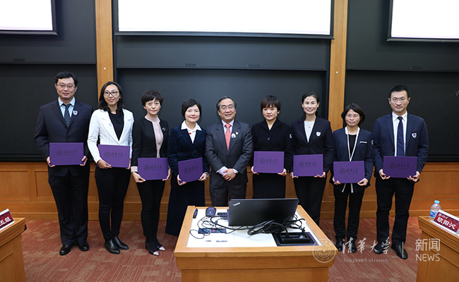 王岩,继续教育处处长邓丽曼,公共管理学院院长助理、干部教育中心主任刘辉以及三位课题指导教师——宣传部常务副部长、新闻中心主任覃川,人事处副处长、人才开发办副主任田煜,科研院副院长、成果办主任王燕分别为各组学员颁发结业证书。