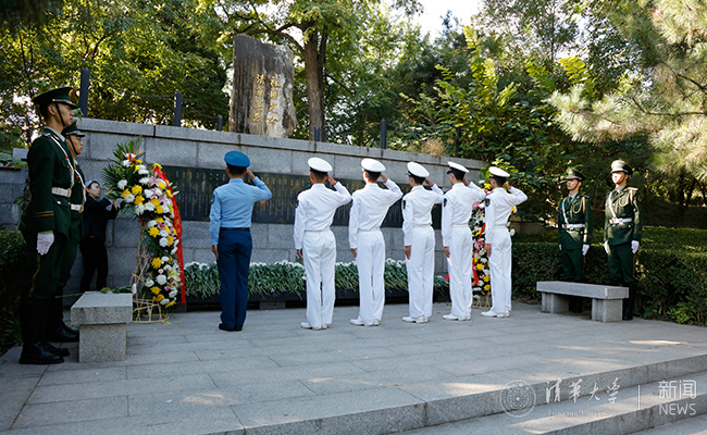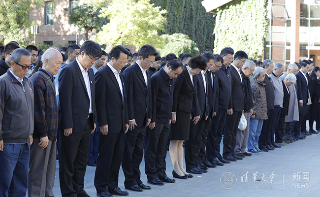 在雄壮的国歌声后,全体师生肃立,向清华英烈以及千千万万为国捐躯的英雄儿女们表示深切哀悼。