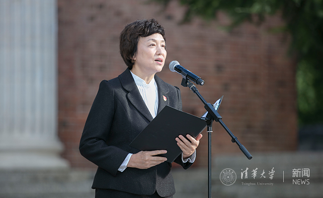 校党委书记陈旭代表全校师生员工,向为了新中国的诞生和人民的安定幸福而抛头颅、洒热血的英烈们,致以沉痛的哀悼、深切的缅怀和崇高的敬意。陈旭表示,爱国与奉献是贯穿清华历史的主线。韦杰三、施滉、沈崇诲等一批清华的优秀儿女用自己的鲜血和生命,实现了光荣的爱国理想,谱写了壮丽的青春之歌。从107年前建校之日起,在承受国耻的清华园里,清华人孕育和生长了极大的爱国热忱,为民族独立和解放作出了巨大贡献。