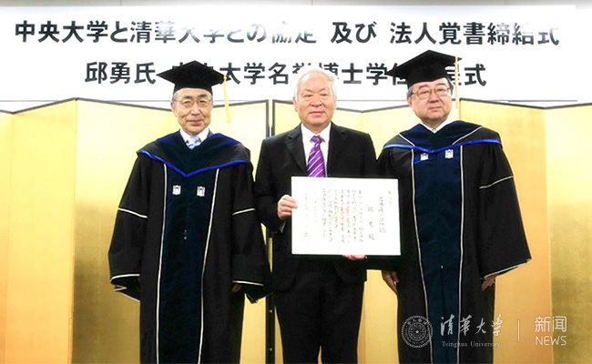 在随后举行的“邱勇校长日本中央大学名誉博士学位授予仪式”上,受邱勇校长委托,顾秉林院士代为接受中央大学总长酒井正三郎颁发的名誉博士证书和学位服。邱勇校长专门录制了视频答谢辞,对获得日本中央大学名誉博士表示感谢,对未能到场深感遗憾,并表示将努力促进中日两国友好关系的发展、努力为两校的合作交流作出更大贡献。