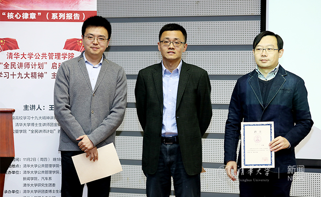“全民讲师计划”启动后,举办了“核心律章”学习十九大精神系列报告“红旗下的一二·九”主题教育宣讲会,邀请公管学院2015级博士生王蔚做了题为“强国在路上,青年当接棒”的报告。报告从面向现代化、面向世界、面相未来三个方面,分享了学习党的十九大精神的心得体会及对当代青年所负使命责任的理解。