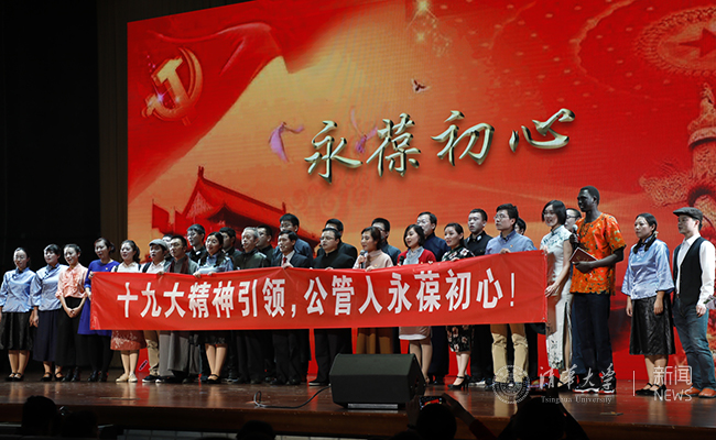 第二场汇演更加丰富多彩。小合唱《天边》《我爱你,塞北的雪》《我和我的祖国》等,舞蹈《光耀未来》《青花叠韵》《祖国高铁亚克西》《东方红》,表演唱《祖国吉祥》《山丹丹开花红艳艳》《党旗下的清华核能》,舞台剧《初心在哪里》《抗战到底,一定胜利》,诗朗诵《还唱一条大河》《我的祖国》……异彩纷呈的演出配以专业的舞美设计,给所有人带来艺术的美的享受,展示着清华人“不忘初心、牢记使命” 的坚定步伐。