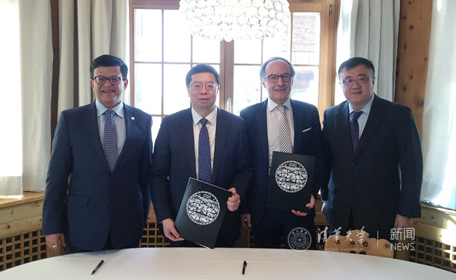 双硕士学位项目协议签署后嘉宾合影。(左起:尼基尔·塞斯、邱勇、弗吕克格尔、杨斌)张艺