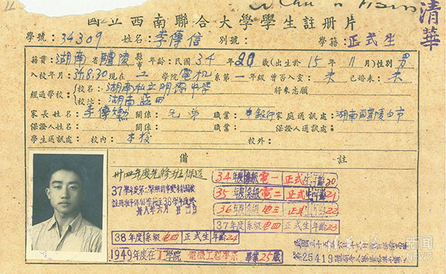 李传信在电机系的学籍卡。