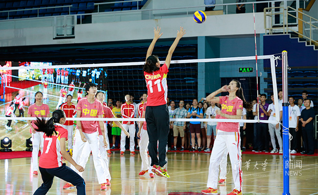 中国女排姑娘与清华女排切磋球艺。记者 张 宇
