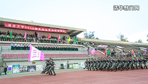 结业典礼从阅兵式和分列式开始。在汇报表演环节,军训学生团表演了军人健身操、旗语操、队列操、军体拳、防化事故应急救援、军营歌曲演唱等军事科目。在军人健身操表演的最后,站在第一排12位同学打开12个写有字卷轴,组成了‘做有行动力的理想主义者!’这振奋人心的口号。在旗语操和队列操表演中都组成了 ‘THU’字样。
