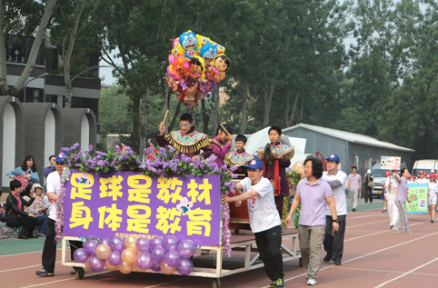 运动会入场式上全体学生人人一个足球迈着矫健的步伐、喊着响亮的“百年附小,有你有我”口号,展现出他们昂扬向上、意气风发的精神风貌。42个班级的“小运动员”们分别代表42个国家或地球的足球队,展示了不同地域的足球文化和清华附小学生的“国际视野”。