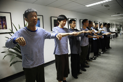 推动景片的演员们在演出结束后谢幕。 高晓蕾