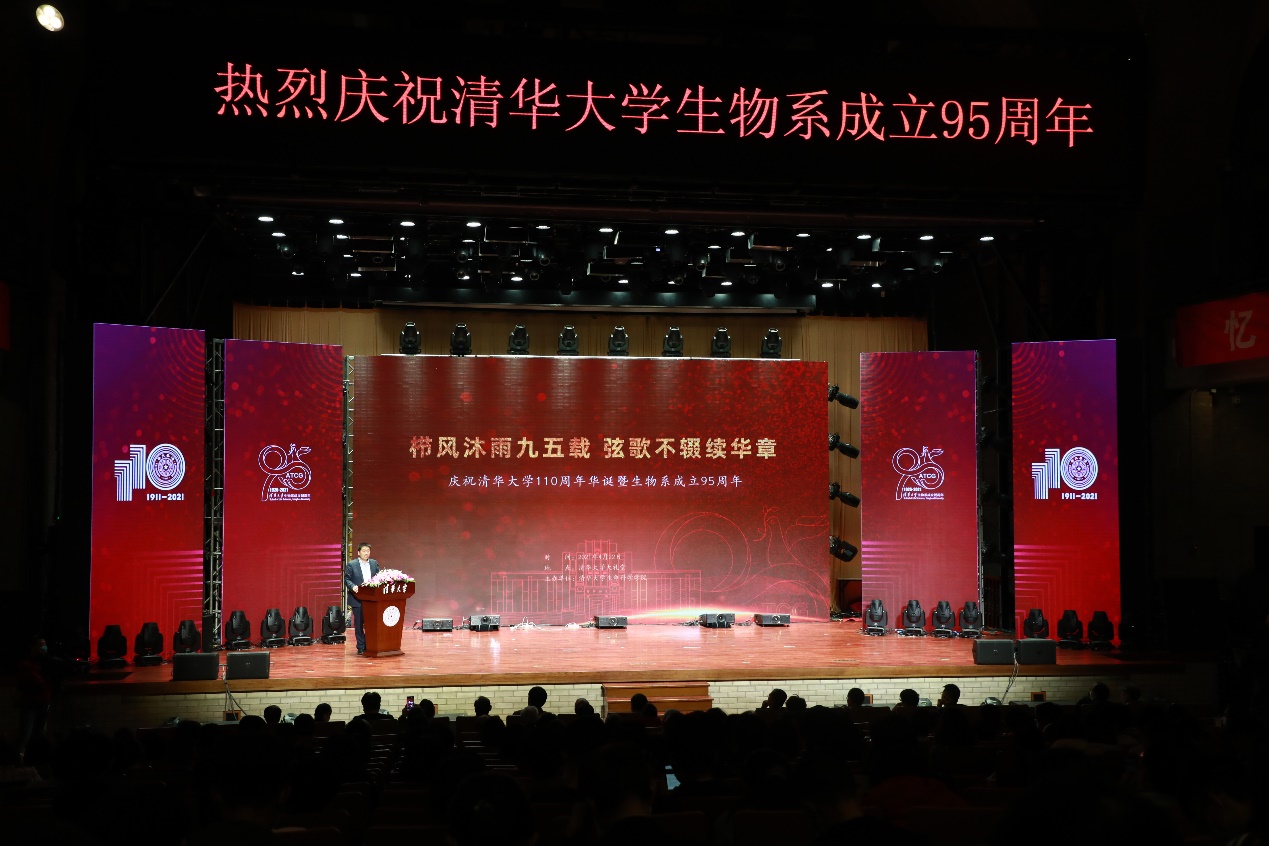 大会还首次播放了为庆祝清华生物系成立95周年特别拍摄的宣传片——《璀璨生命的光阴》以及毕业校友和在校师生共同录制的祝福视频。庆祝大会后,在清华大礼堂上演了由生命学院师生共同演绎的联欢晚会。歌舞、相声、乐器表演、话剧、乐队演出等,晚会形式丰富,精彩纷呈。最后,庆祝大会在全体师生齐唱歌曲《相亲相爱》的热烈氛围中落下帷幕。