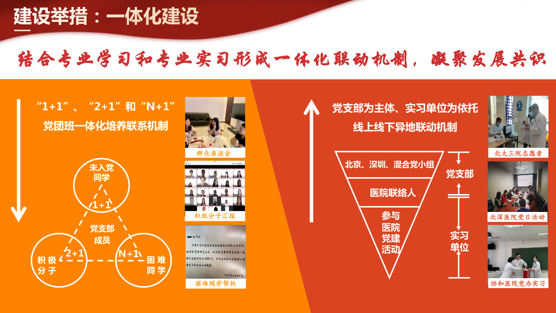 3.突破地理阻隔:丰富活动形式,实现多方联动。面对成员长期分处7个省市的地理阻隔,支部通过线上线下结合的方式,建立完善了党小组+校内党支部+校外单位的多方联动网络。党小组的设置上,由支委担任党小组组长,根据区域划分为北京、深圳和混合党小组。以党小组为单位,线下开展“寻觅红楼英雄志”“遇见深圳”等8场实践活动。校内,以新老支部传帮带为纽带,联动医管专业20级、21级党支部共同举办实习经验分享、专业讲座6次;以师生支部、学生支部共建为契机,深入深海洋研211等4个党支部开展建设经验分享。校外,鼓励党员同志积极深入实习医院的党建活动,在北京协和医院等国内13家医院,参与建党百年活动筹备、“我心向党 科学报国”演讲比赛等活动20余次;与华西医学院生物治疗国重18级硕士党支部等校外学生支部开展联学共建3次。通过完善的组织结构,丰富的活动形式,有效突破了成员的地理阻隔。