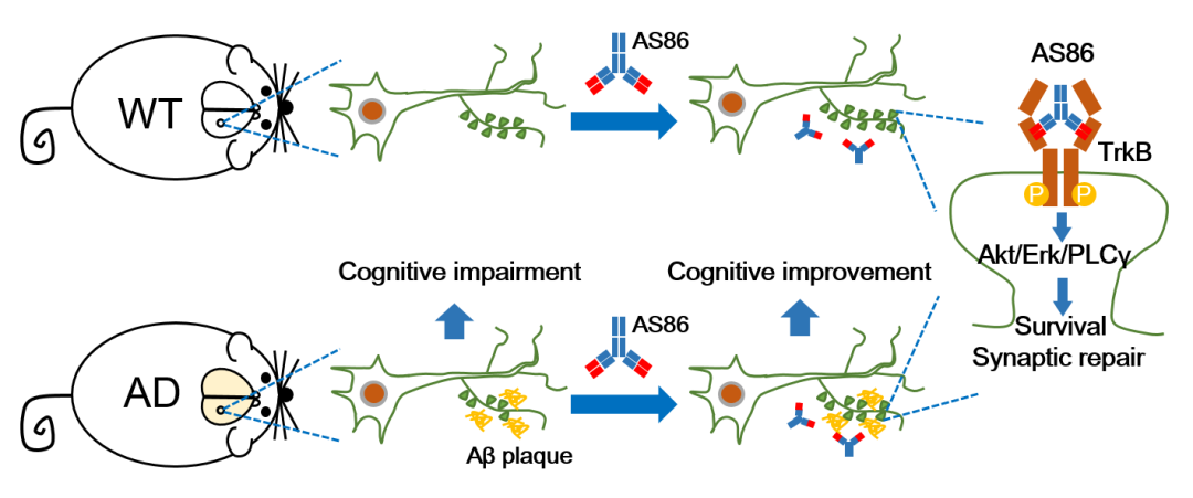 因此,研究认定TrkB激活型抗体药物AS86在AD治疗中具有很好的潜力,与清除Aβ的药物联用时能够达到更好的疗效。值得注意的是,AS86并不能减缓Aβ病理发展,突触修复和神经保护才是AS86的核心作用机制。