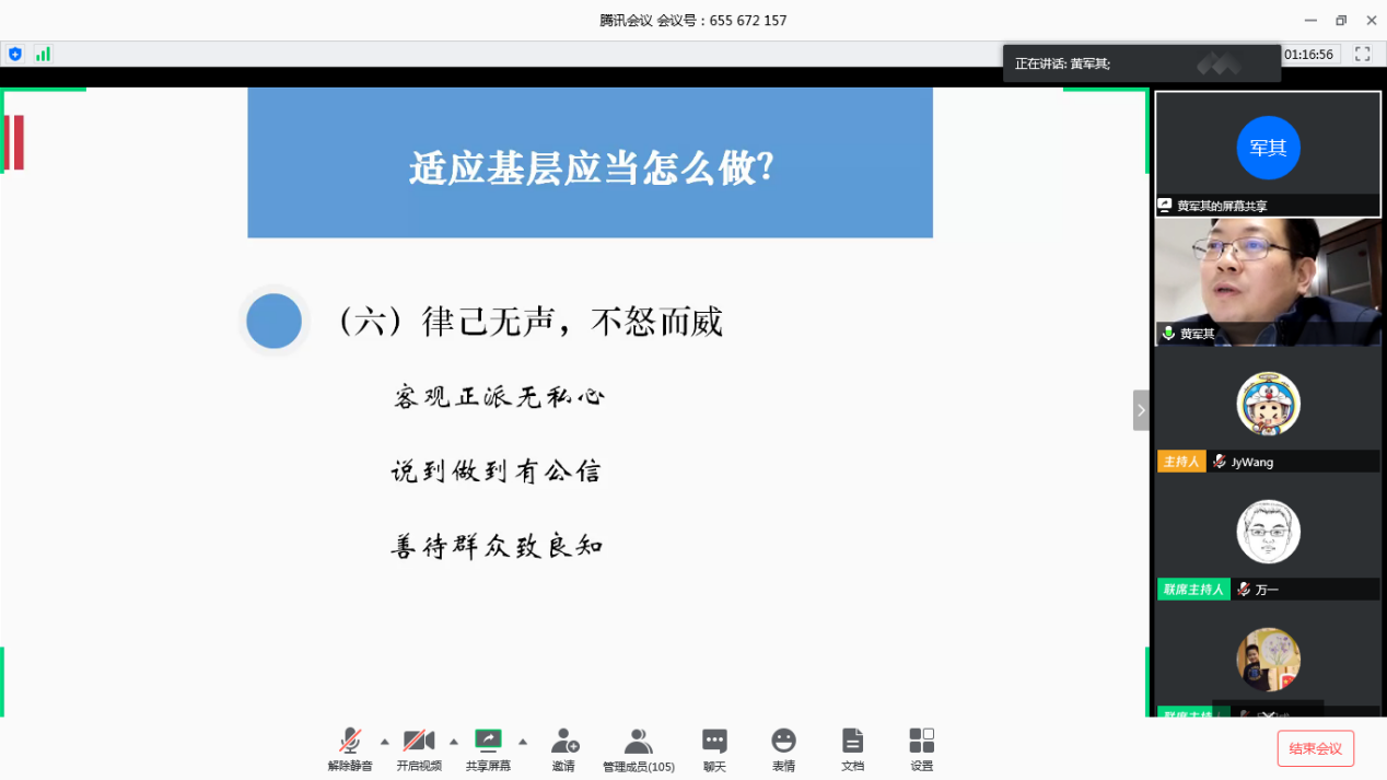 随后,黄军其也分享了抗击疫情过程中的工作体会。他在信访部门工作,前段时间信访工作因疫情暂停开放来访接待窗口,但是通过来信和网络反映问题和解决矛盾的渠道一直都保持畅通。疫情结束后,许多老问题和疫情导致的新信访问题叠加,带来了更大的工作压力,但工作人员始终以敬业的态度认真对待老百姓的每一个问题。保百姓心安,护社会稳定,就是信访部门在全民抗疫中必须扛起的“硬核”担当。