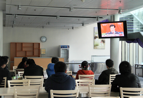 环境学院地下餐厅集中观看十八大直播的同学。