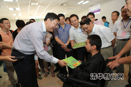 图为校长陈吉宁将绿色通道“爱心纪念封”亲手送给身残志坚的计算机系新生矣晓沅。记者 智斐